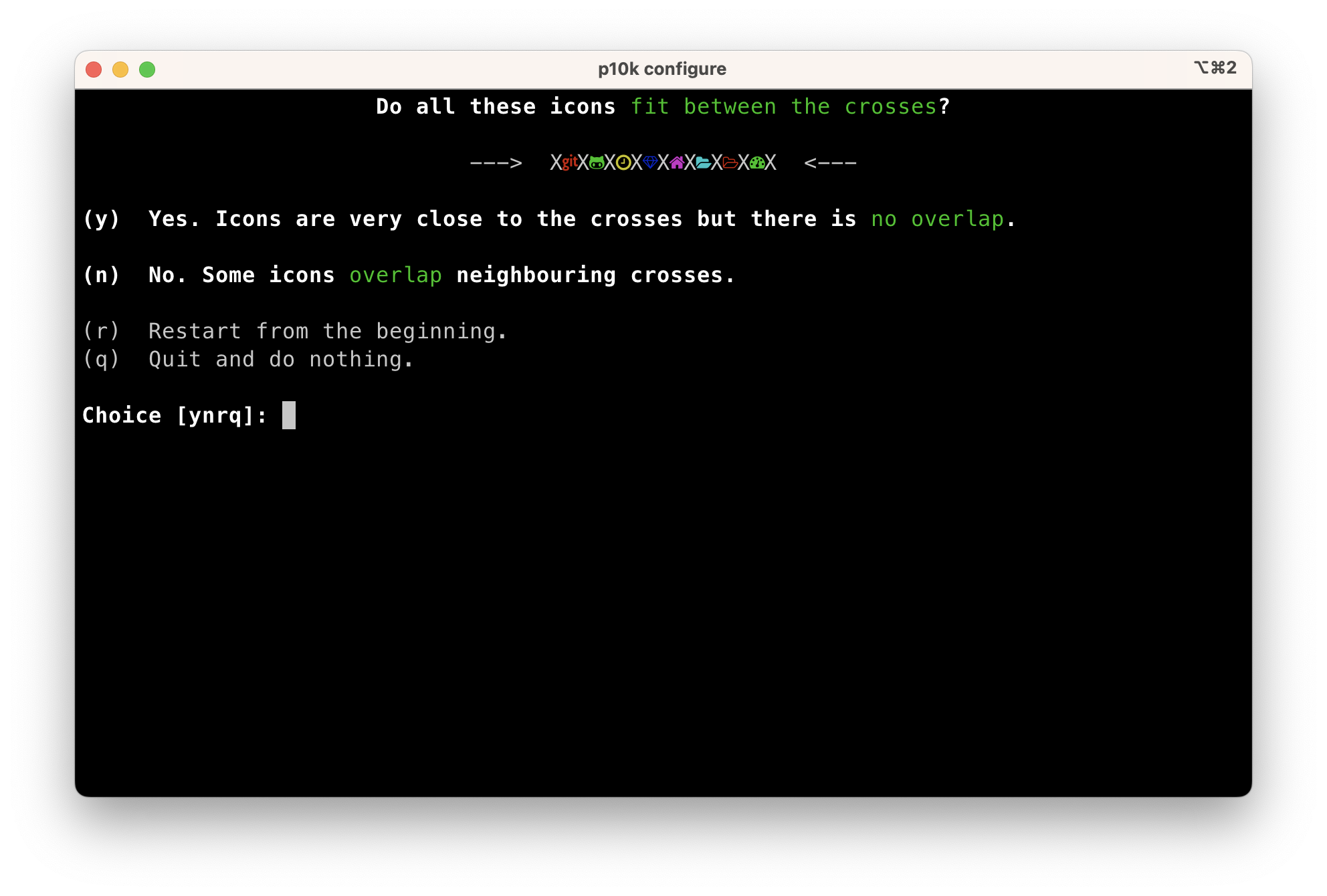 질문을 차분히 읽고, 원하는 대로 결정하면 된다. 실수하더라도 뒤로 갈 수 있고, 설정이 끝난 뒤에도 p10k configure 명령어로 다시 설정이 가능하므로 부담 갖지 않아도 된다.