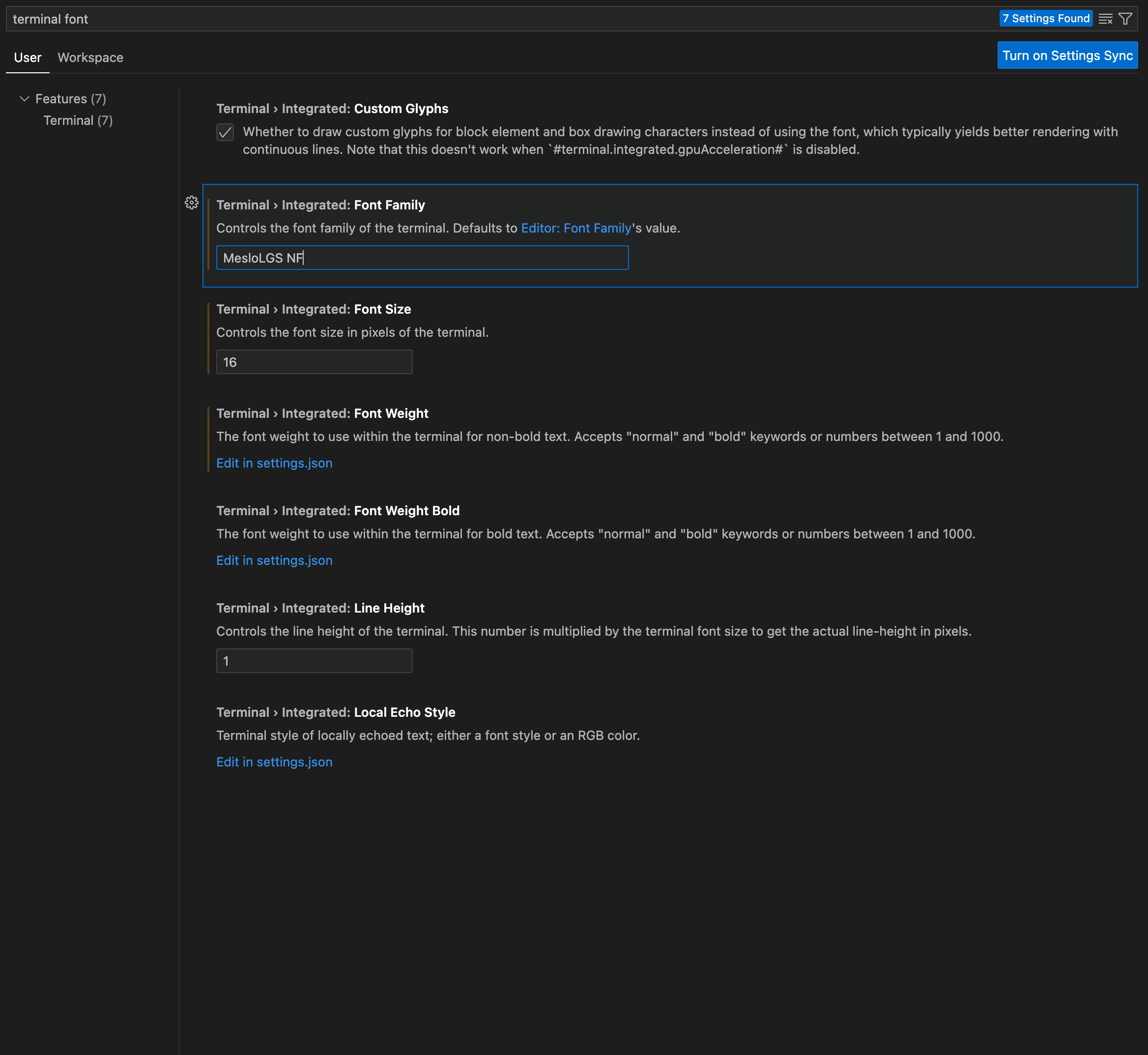 Search settings > "terminal font" 검색 > Terminal > Integrated: Font Family > MesloLGS NF 입력