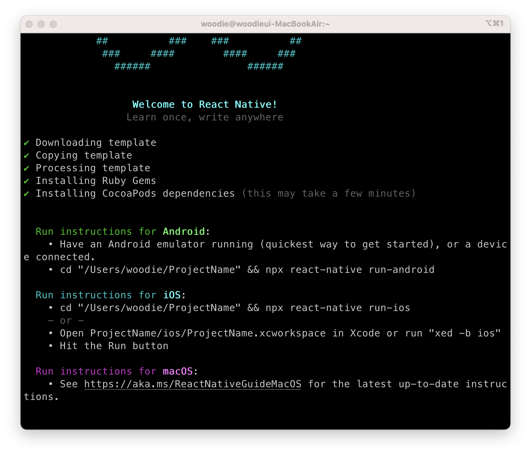 가설: 그럼 npx 커맨드에서 사용됐던 react-native 라이브러리를 설치해서 이걸로 프로젝트를 생성하면 설치가 될 것이다.
