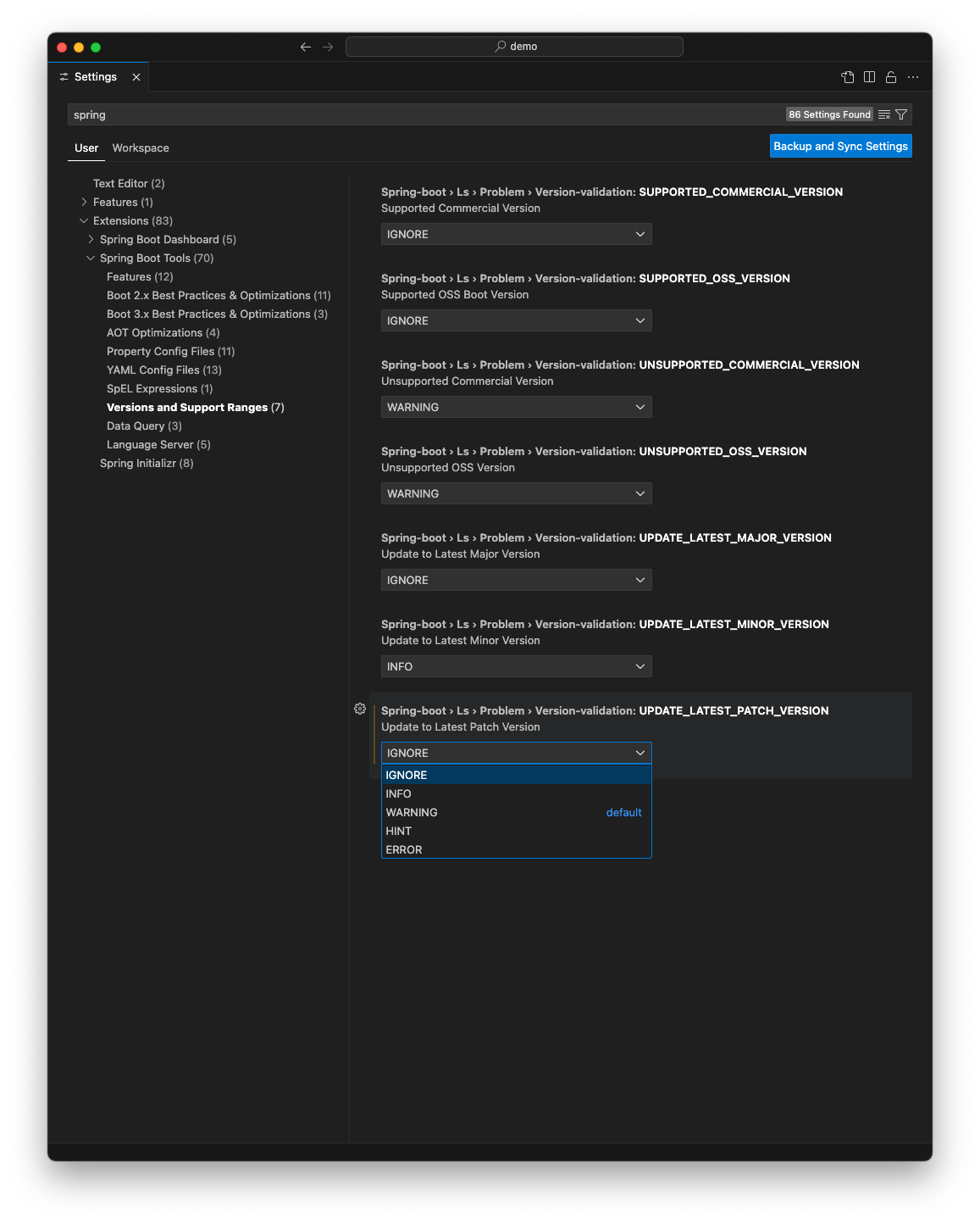 VSCode > Preferences > Settings > 'spring-boot' 검색 > 좌측 네비게이터에서 'extentions' - 'spring boot tools' - 'versions and support ranges' 항목 선택 > 스크롤 내리면서 UPDATE_LATEST_PATCH_VERSION 항목 찾기 > 해당 옵션 WARNING에서 IGNORE로 변경